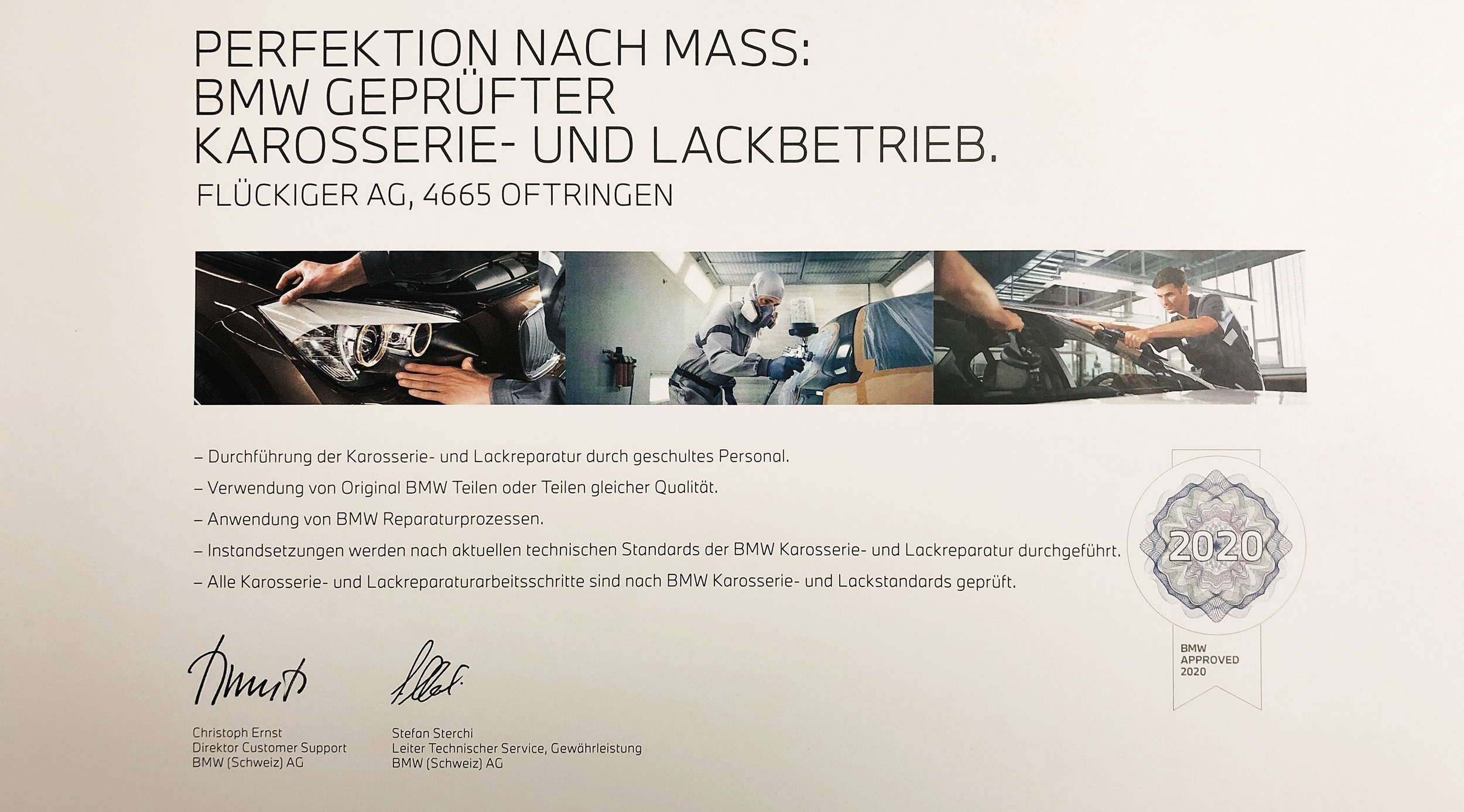 BMW gehört zu den innovativsten Automobil-Herstellern. Die hohe Sicherheit der Karosserien soll auch nach einer Instandsetzung zu 100% sichergestellt werden. Diese Sicherheit können wir von Flückiger garantieren. Verbunden mit der uneingeschränkten Weiterführung der Werksgarantie und einer zusätzlichen, lebenslangen Garantie auf alle ausgeführten Arbeiten!