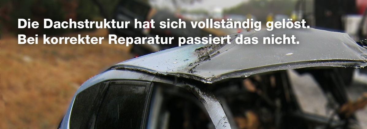 Anstelle des korrekten Reparaturverfahrens mittels klar definierten Schweissverbindungen verklebte der Instandsetzungsbetrieb das Dach ohne weitere Verbindungselemente wie Nieten usw. Beim ausführenden Unternehmen handelt es sich um einen renommierten Autohändler mit mehreren Vertretungen und eigener Karosserieabteilung.