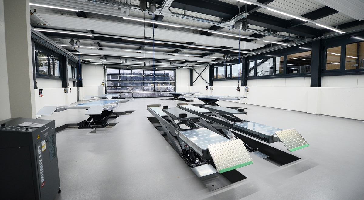 Im neuen Gebäude werden Fahrwerke von neusten Automobilen eingestellt wie auch Radarsysteme, Kameras und moderne Lichtsysteme kalibriert. Für den Boden gilt eine absolute Nulltoleranz: Im Bereich Diagnose/Einstellung wird der Boden auf den Millimeter genau nivelliert. Damit sind wir für sämtliche zukünftigen Herausforderungen bestens gerüstet.