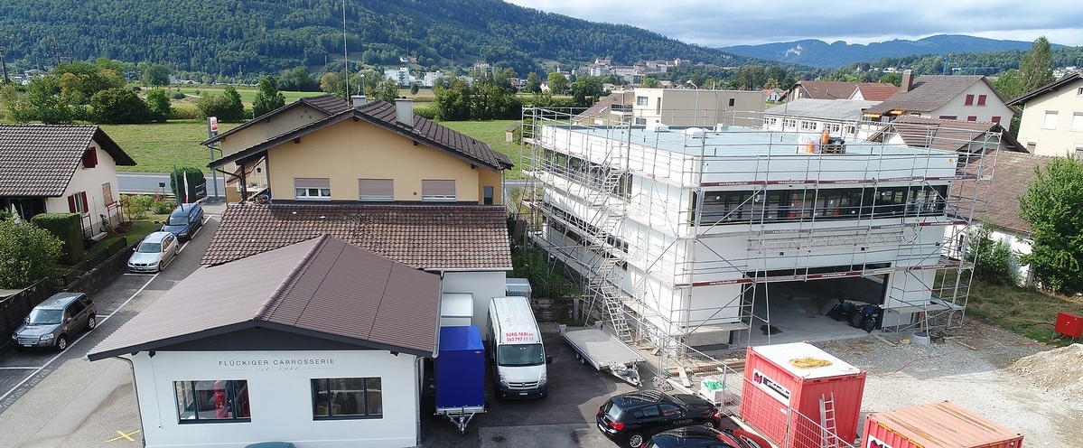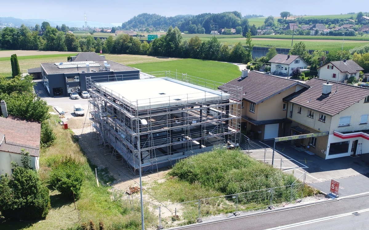 Nachdem Fassade und Fenster montiert sind, beginnt der Innenausbau. Das Bauprogramm wird perfekt eingehalten und Mitte Oktober sollte der Neubau benützt werden können. Links im Bild sehen wir den Betrieb aus den Gründerjahren, welcher vor über 30 Jahren durch das aktuelle Betriebsgebäude abgelöst wurde.
