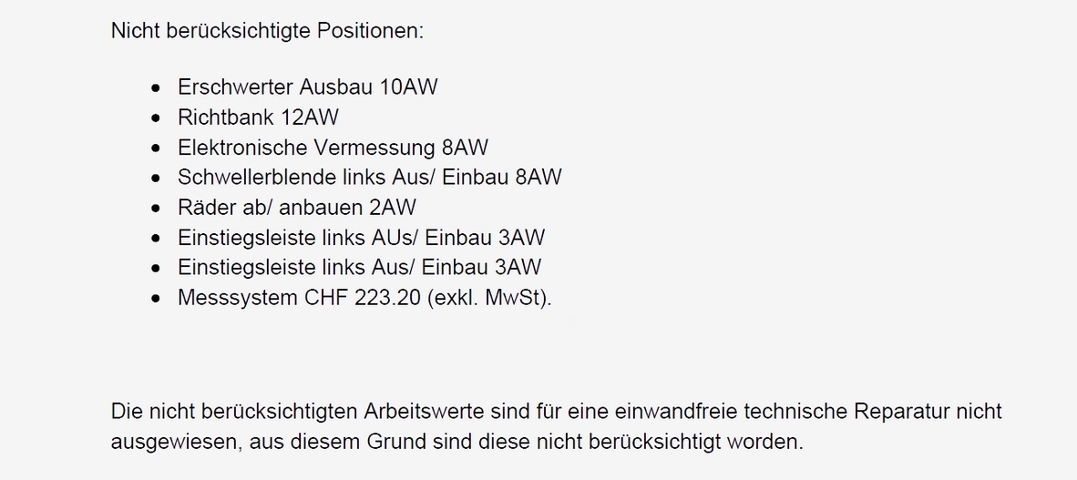 Bei dem knapp halbjährigen Fahrzeug mit einem Neupreis von gegen CHF 90'000.- wurde die Seite stark beschädigt. Die B-Säule war deformiert. Der Mitarbeiter der zuständigen Versicherungsgesellschaft verweigerte uns die Kostenübernahme für die elektronische 3D-Vermessung. Nur eine solche Vermessung stellt sicher, dass das Fahrzeug korrekt gemäss Fahrzeughersteller repariert werden kann. Interventionen bis zum Schadenchef der entsprechenden Versicherung blieben erfolglos.